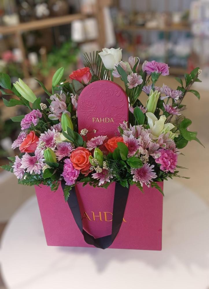 شوكولاته مع ورد الفاخر، لتقديم هدية مميزة خلال المناسبات الخاصة مع لمسة رمضانية جميلة.